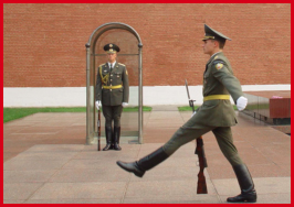 After the wedding they pose beside the honour guard who protect the Tomb of the Unknown Soldier in the Kremlin wall.